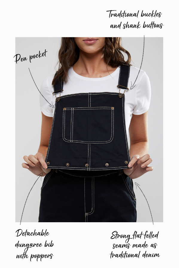 Side seam and back pockets and pocket to bib with pen holder pocket.