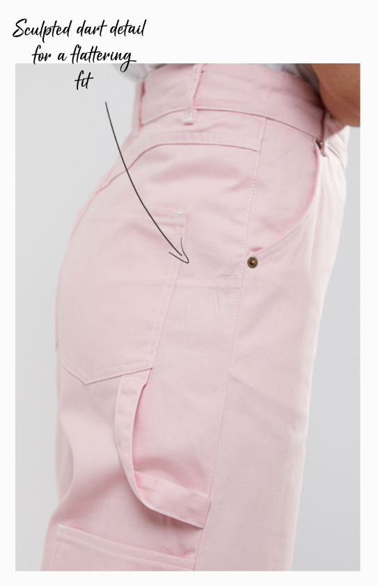 Side seam and back pockets and pocket to bib with pen holder pocket.